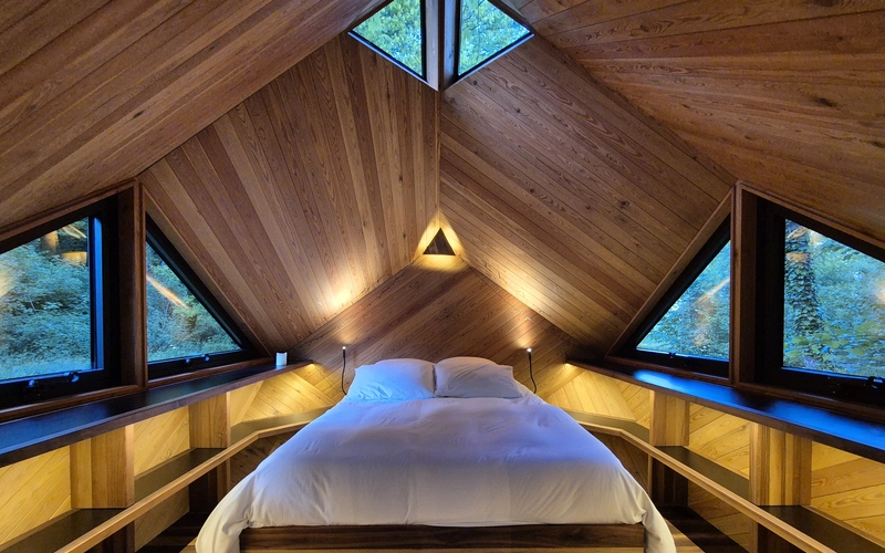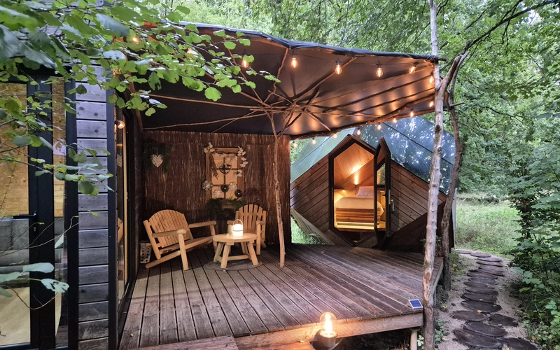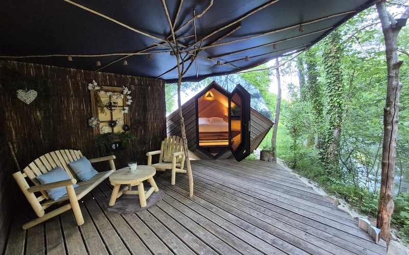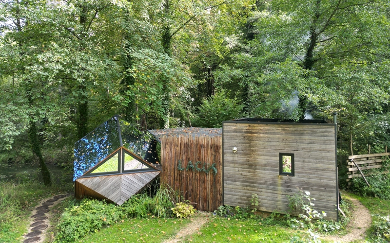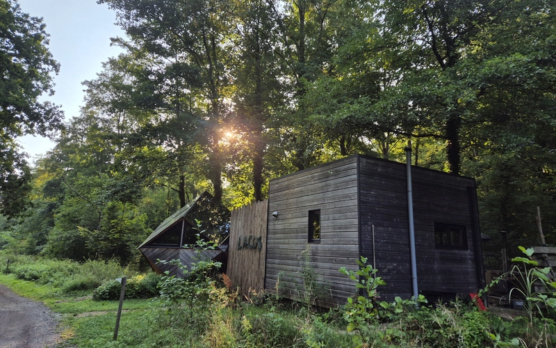 Deux modules distincts, totalisant 23 m², composent votre cocon douillet. Le premier, en forme de « zôme », est dédié au repos et à la méditation. Son architecture géométrique, telle une empreinte bienveillante, favorise le bien-être et la quiétude. Vous vous reconnectez à vous-même, à vos pensées et à la nature environnante. A l’intérieur, un lit de 140 x 200 cm vous attend pour des nuits bercées par le chant des oiseaux et le murmure apaisant du ruisseau.