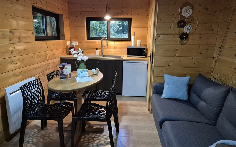 Le second module, en forme de cube, abrite toutes les commodités nécessaires à votre confort. Une cuisine équipée vous permettra de préparer de délicieux repas, tandis que la salle de bain et les WC vous offriront un espace privatif pour votre confort.